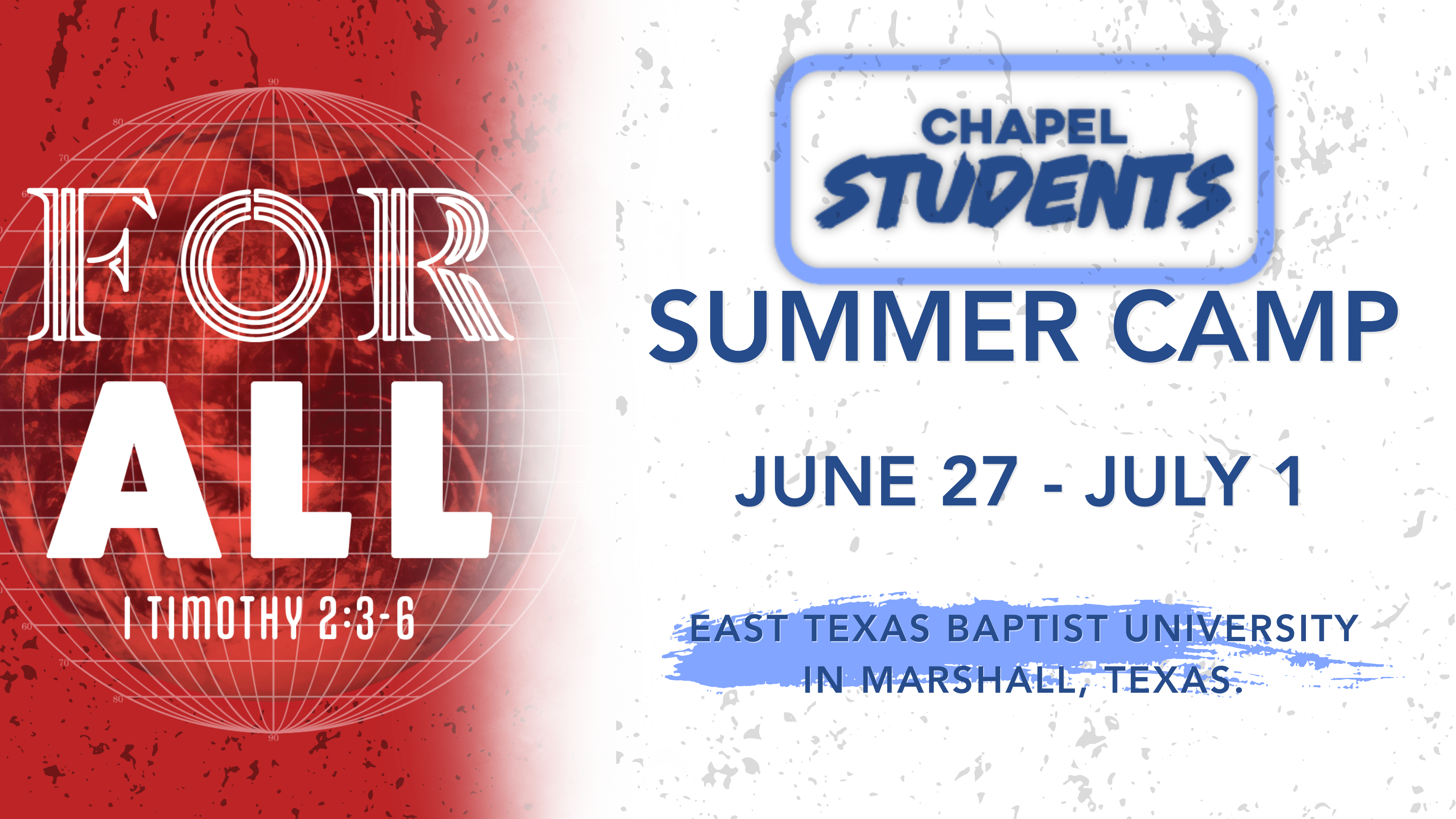 The students of Granbury Chapel are going to Summer Camp! June 27 - July 1 at East Texas Baptist University. Current 5th grade - 12th Grade students will be challenged to grow deeper in their faith and to live it out boldly! Contact James Young with questions related to 2026 Summer Camp! The cost per student is $320. Scholarships are available. jyoung@granburychapel.org